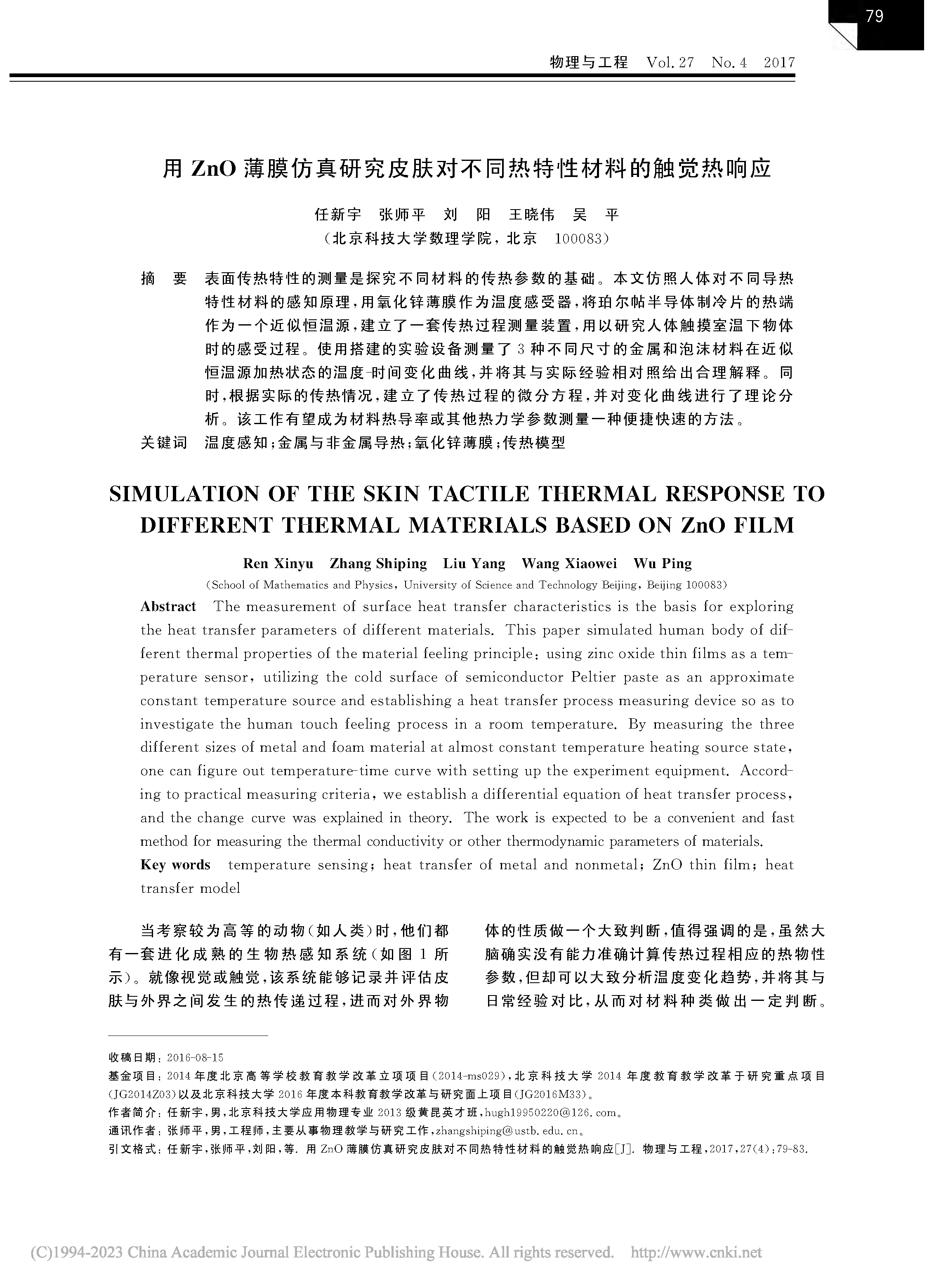 [45] 任新宇,张师平,刘阳,王晓伟,吴平. 用ZnO薄膜仿真研究皮肤对不同热特性材料的触觉热响应. 物理与工程,2017,27(04):79-83.