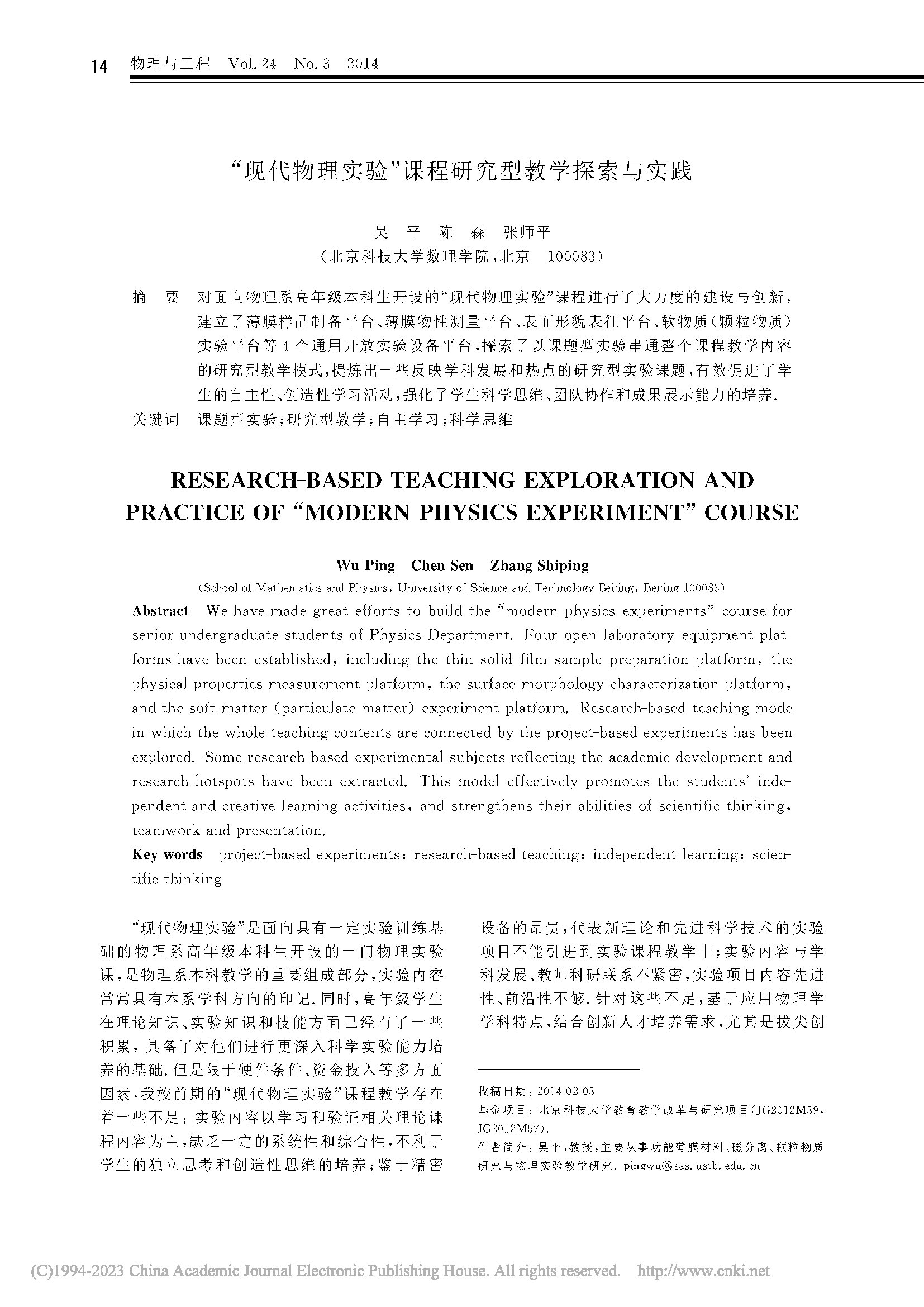 [49] 吴平,陈森,张师平. “现代物理实验”课程研究型教学探索与实践. 物理与工程,2014,24(03):14-17.