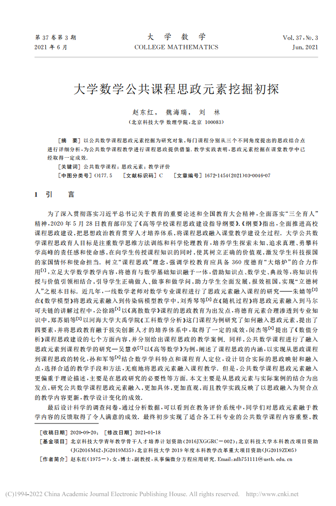 [9] 朱婧,陈学慧,司新辉. 疫情背景下微积分“课程思政”的教学探索与实践. 大学数学,2021,37(1):33-38.