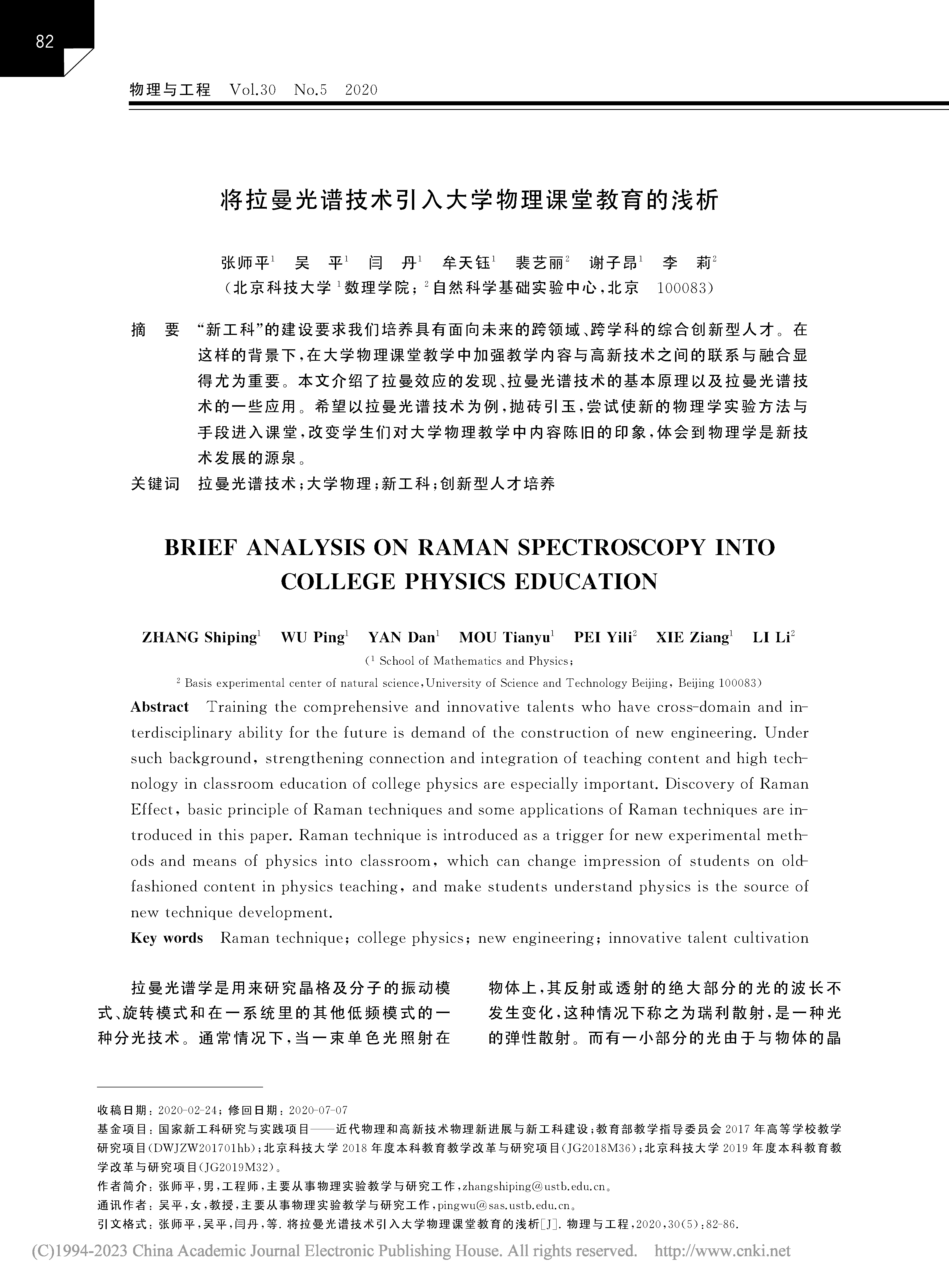 [39] 张师平,吴平,闫丹,牟天钰,裴艺丽,谢子昂,李莉. 将拉曼光谱技术引入大学物理课堂教育的浅析. 物理与工程,2020,30(05):82-86.