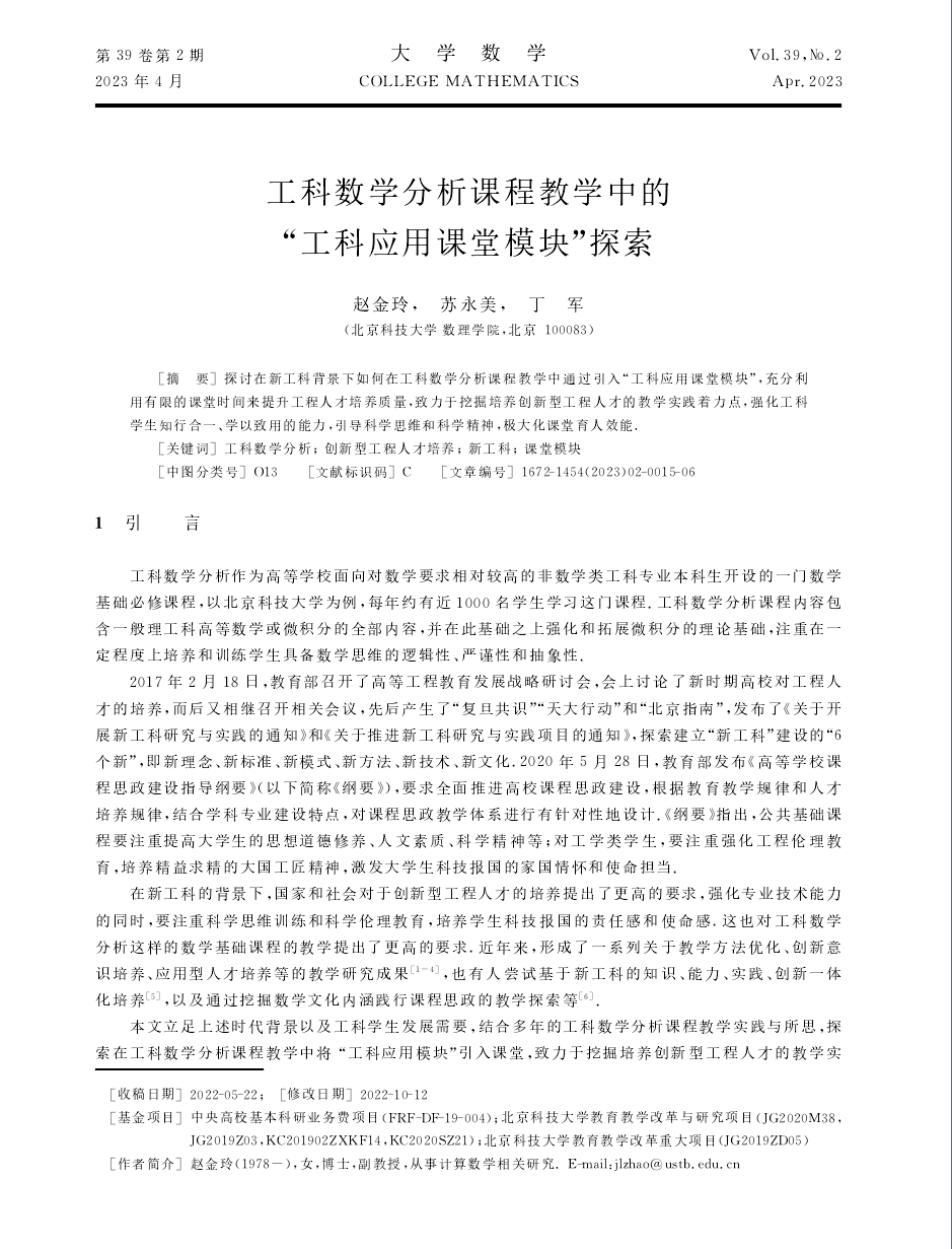 [21] 赵金玲,苏永美,丁军. 工科数学分析教学中“工科应用课堂模块”探索. 大学数学,2023,39(2):15-20.