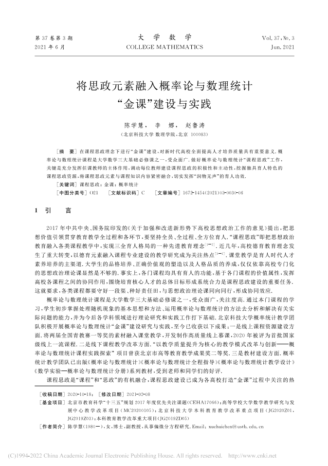 [10] 陈学慧,李娜,赵鲁涛. 将思政元素融入概率论与数理统计“金课”建设与实践. 大学数学,2021,37(3):30-35.
