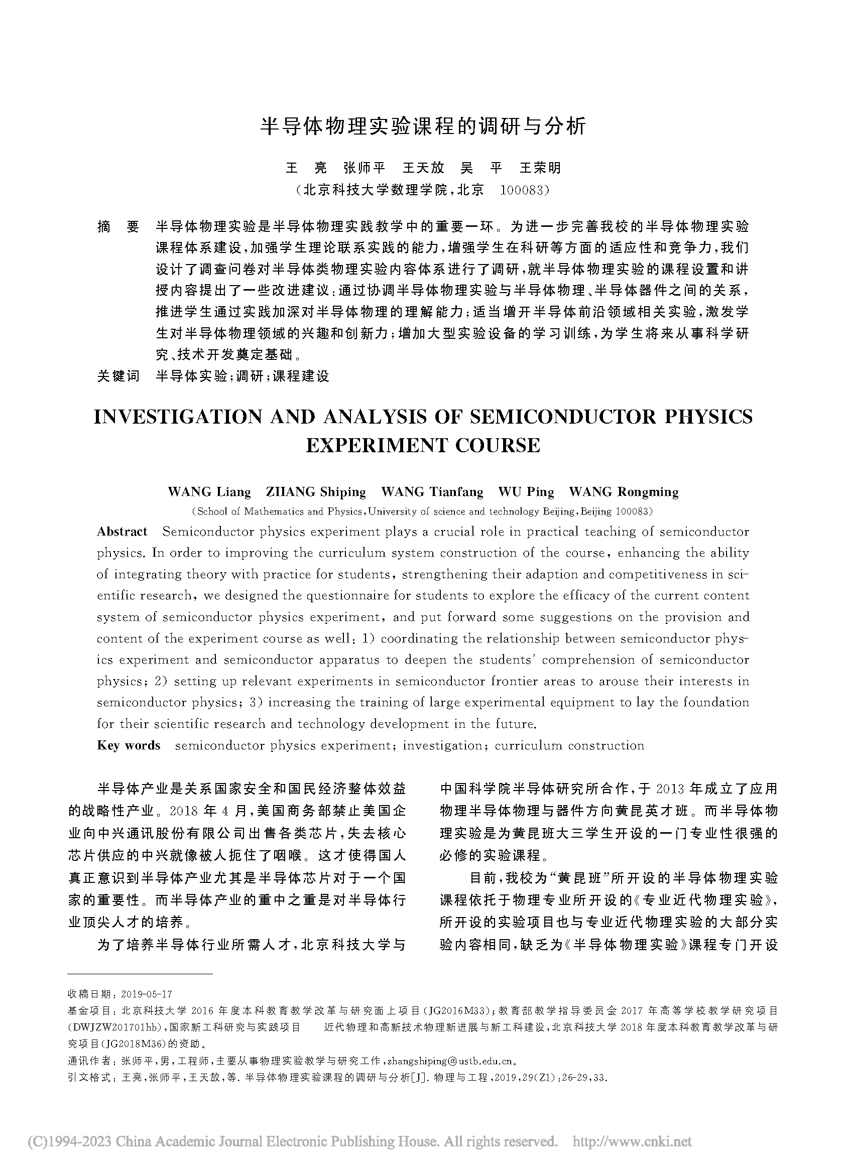 [40] 王亮,张师平,王天放,吴平,王荣明. 半导体物理实验课程的调研与分析. 物理与工程,2019,29(S1):26-29+33.