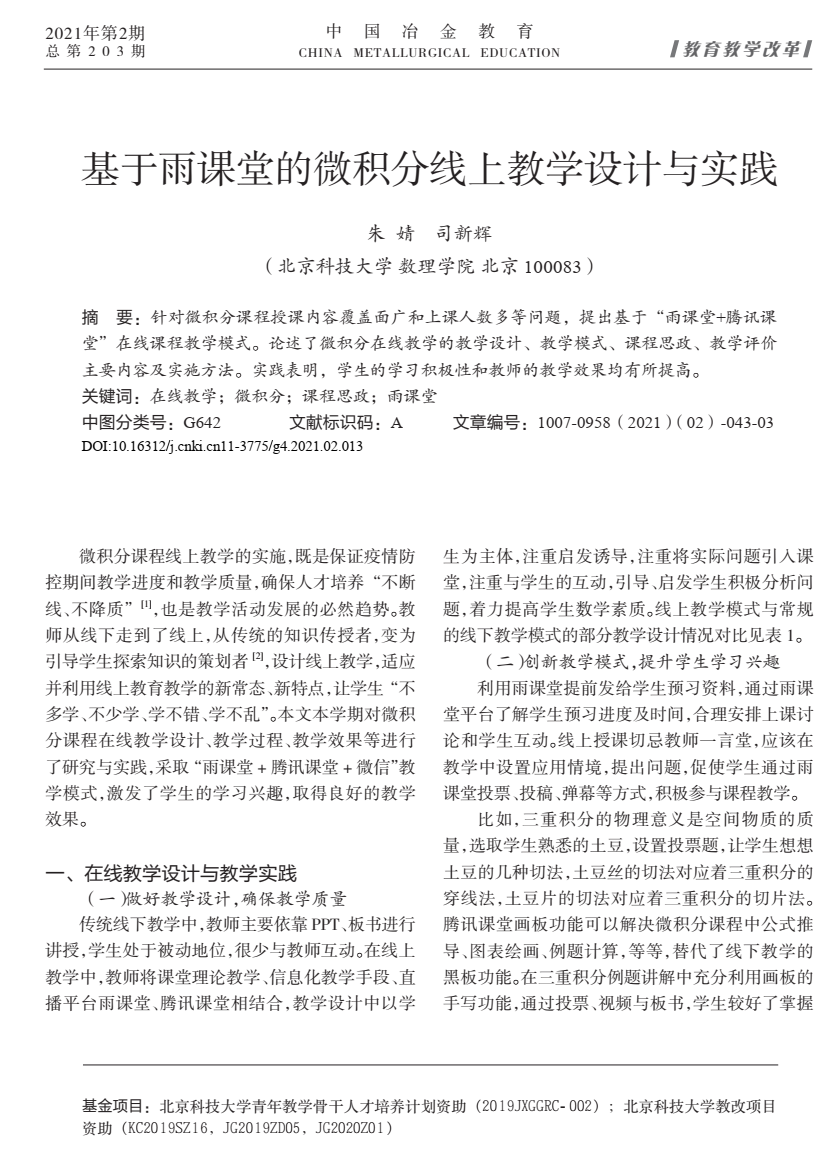 [24] 朱婧,司新辉. 基于雨课堂的微积分线上教学设计与实践. 中国冶金教育,2021,2:43-45.