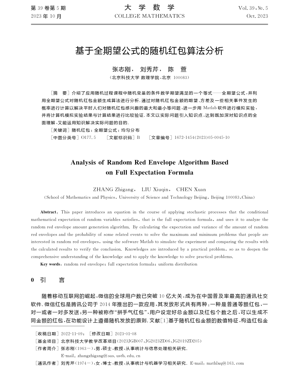 [22] 张志刚,刘秀芹,陈萱. 基于全期望公式的随机红包算法分析. 大学数学,2023,39(5):45-54.