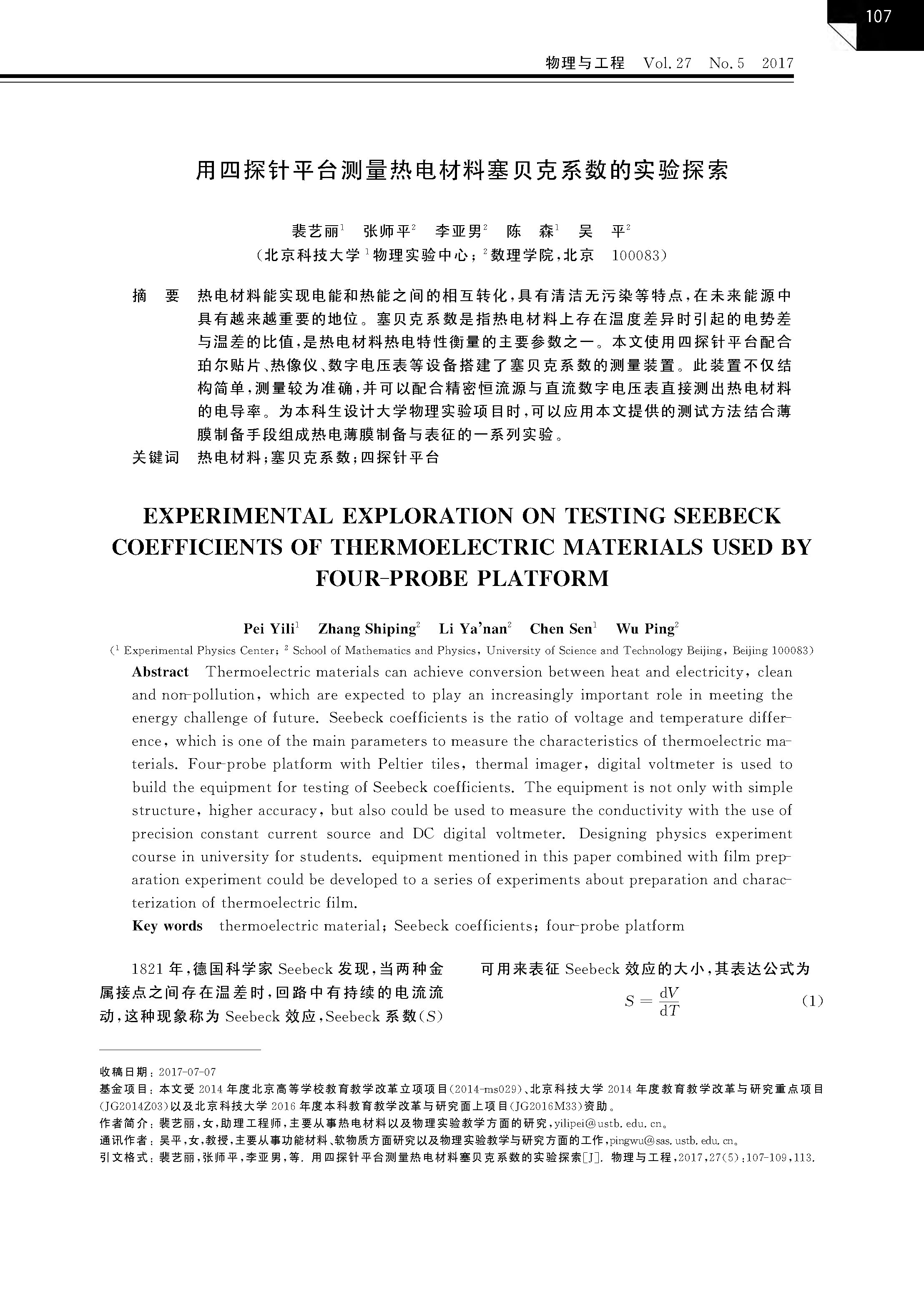 [43] 裴艺丽,张师平,李亚男,陈 森,吴 平. 用四探针平台测量热电材料塞贝克系数的实验探索. 物理与工程,2017,27:1077-109.