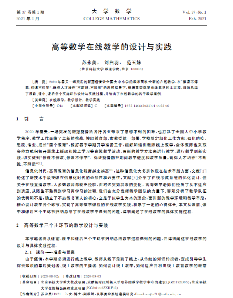 [8] 苏永美,刘白羽,范玉妹. 高等数学在线教学的设计与实践. 大学数学,2021,37(1):22-26.