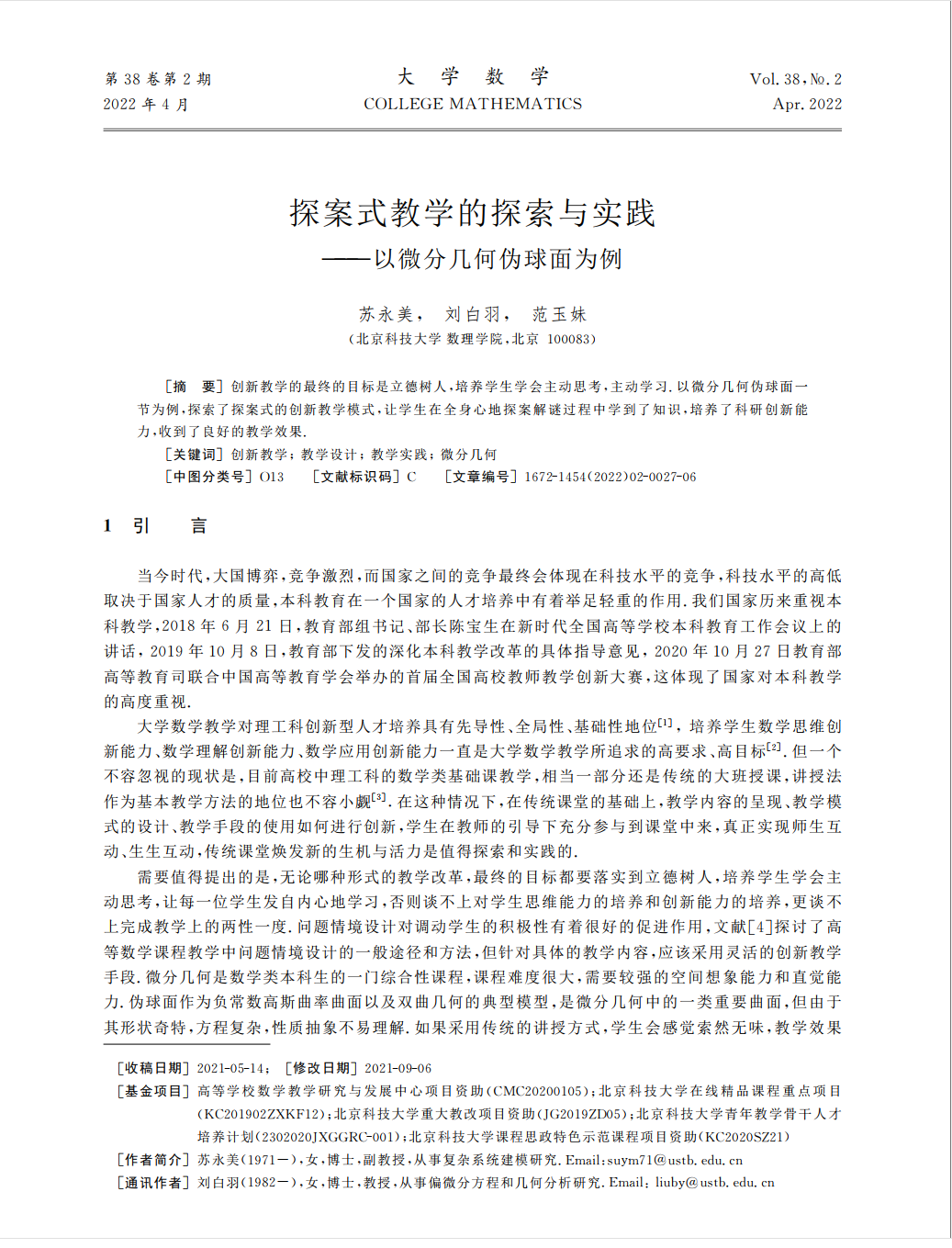 [15] 苏永美,刘白羽,范玉妹. 探案式教学的探索与实践--以微分几何伪球面为例. 大学数学,2022,38(2):27-32.