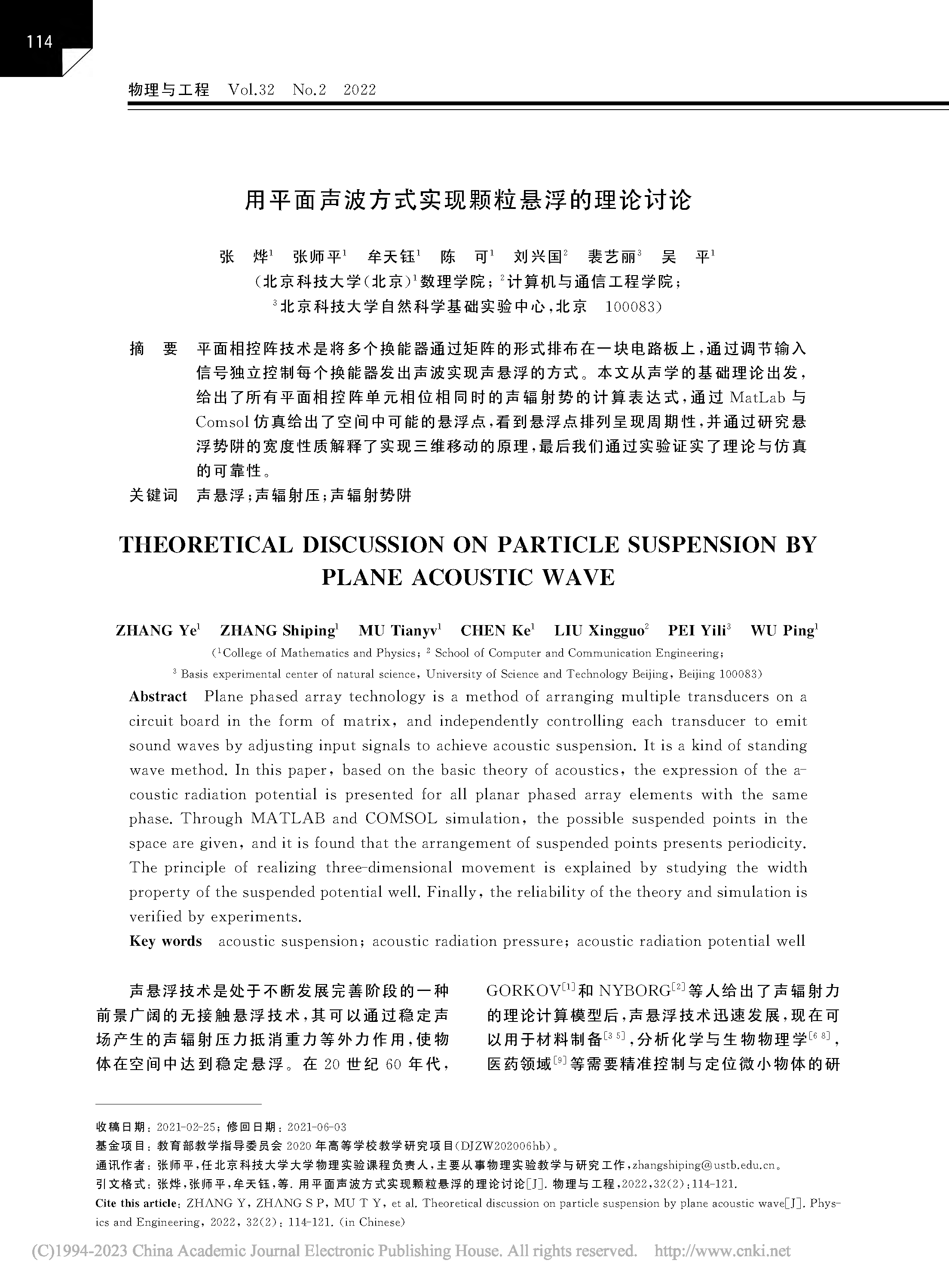 [34] 张烨,张师平,牟天钰,陈可,刘兴国,裴艺丽,吴平. 用平面声波方式实现颗粒悬浮的理论讨论. 物理与工程,2022,32(02):114-121.