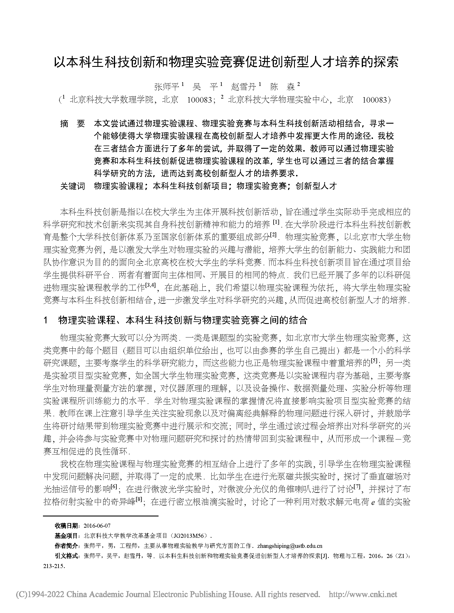[47] 张师平,吴平,赵雪丹,陈森. 以本科生科技创新和物理实验竞赛促进创新型人才培养的探索. 物理与工程,2016,26(S1):213-215.