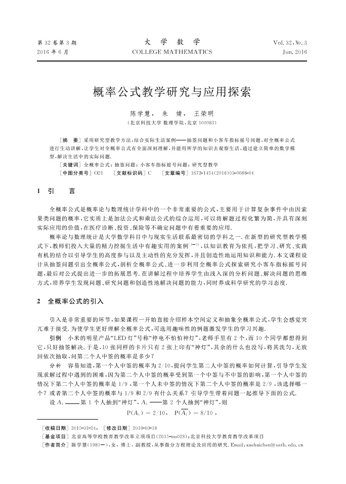 [5] 陈学慧,朱婧,王荣明. 概率公式教学研究与应用探索. 大学数学,2016,32(3):86-89.