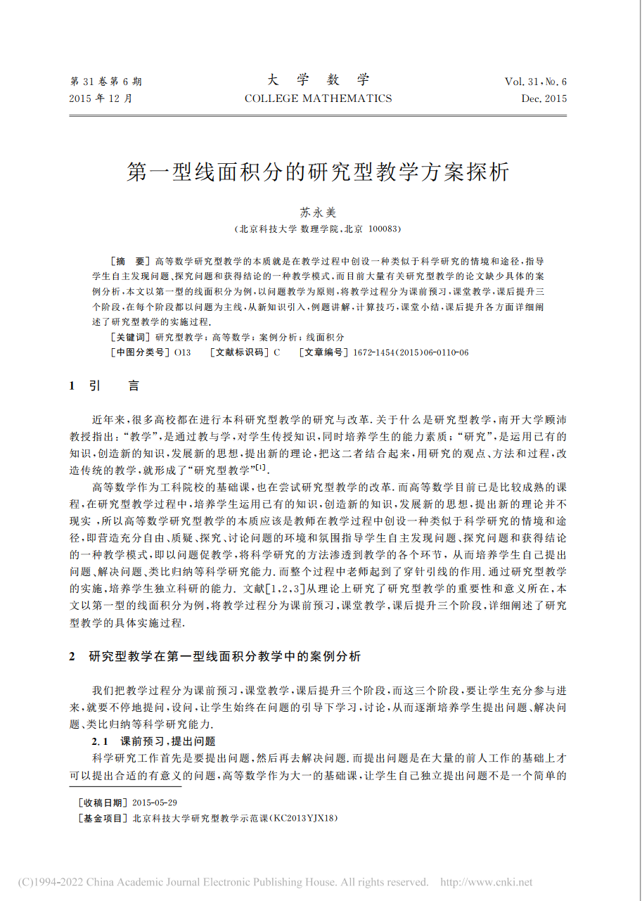 [4] 苏永美. 第一型线面积分的研究型教学方案探析. 大学数学,2015,31(6):110-115.