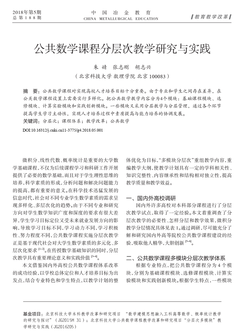 [26] 朱婧,张志刚,胡志兴. 公共数学课程多层次教学研究与实践. 中国冶金教育,2018(5):1-4.
