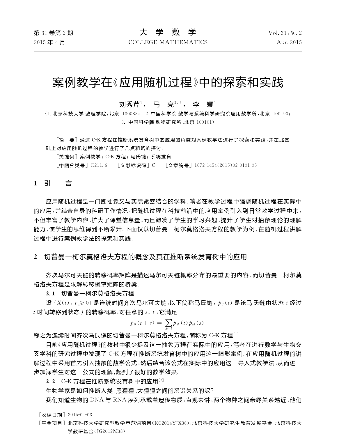 [2] 刘秀芹,马亮,李娜. 案例教学在《应用随机过程》中的探索和实践. 大学数学,2015,31(2),101-105.