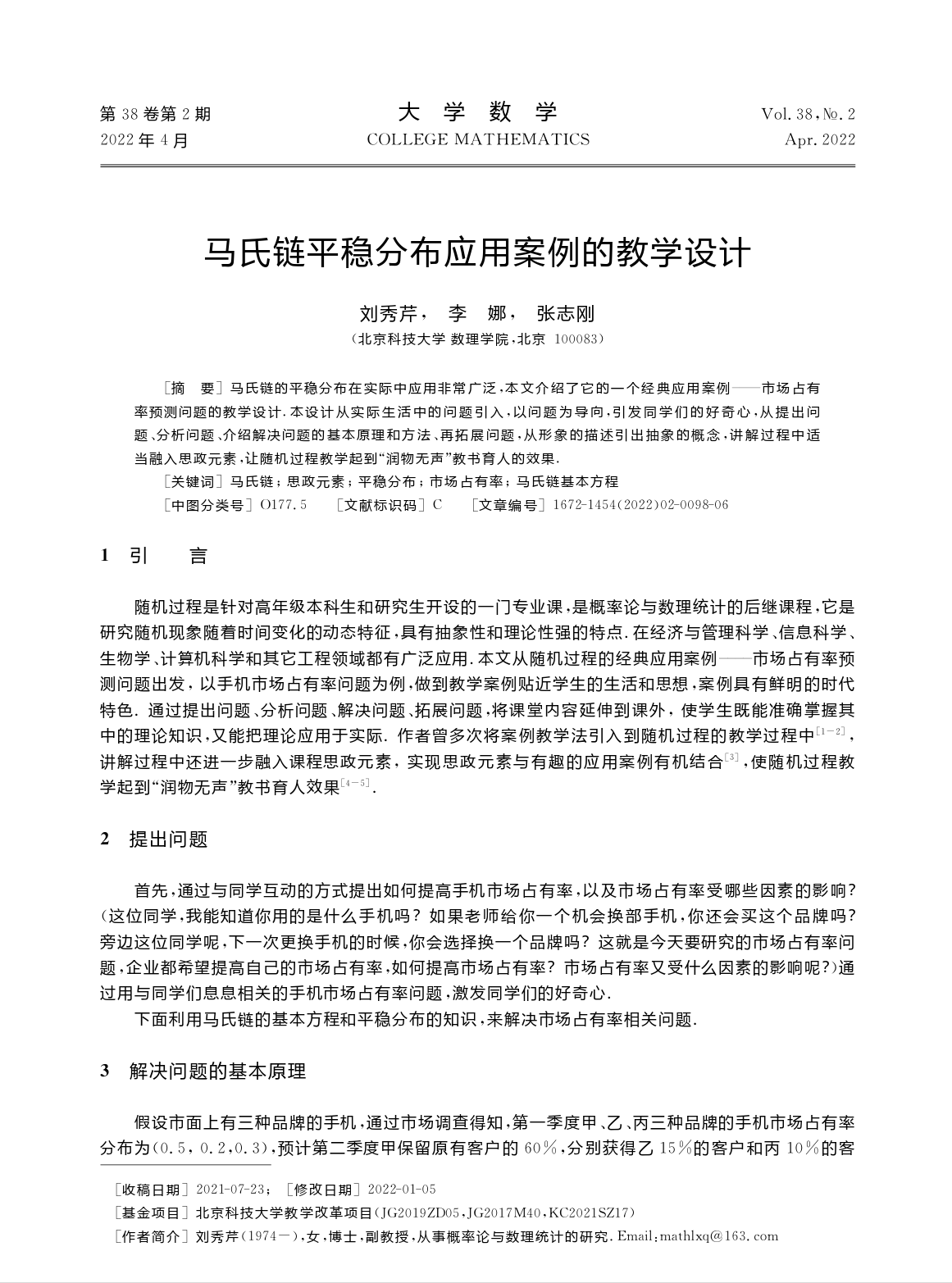 [17] 刘秀芹,李娜,张志刚. 马氏链平稳分布应用案例的教学设计. 大学数学,2022,38(2):98-103.