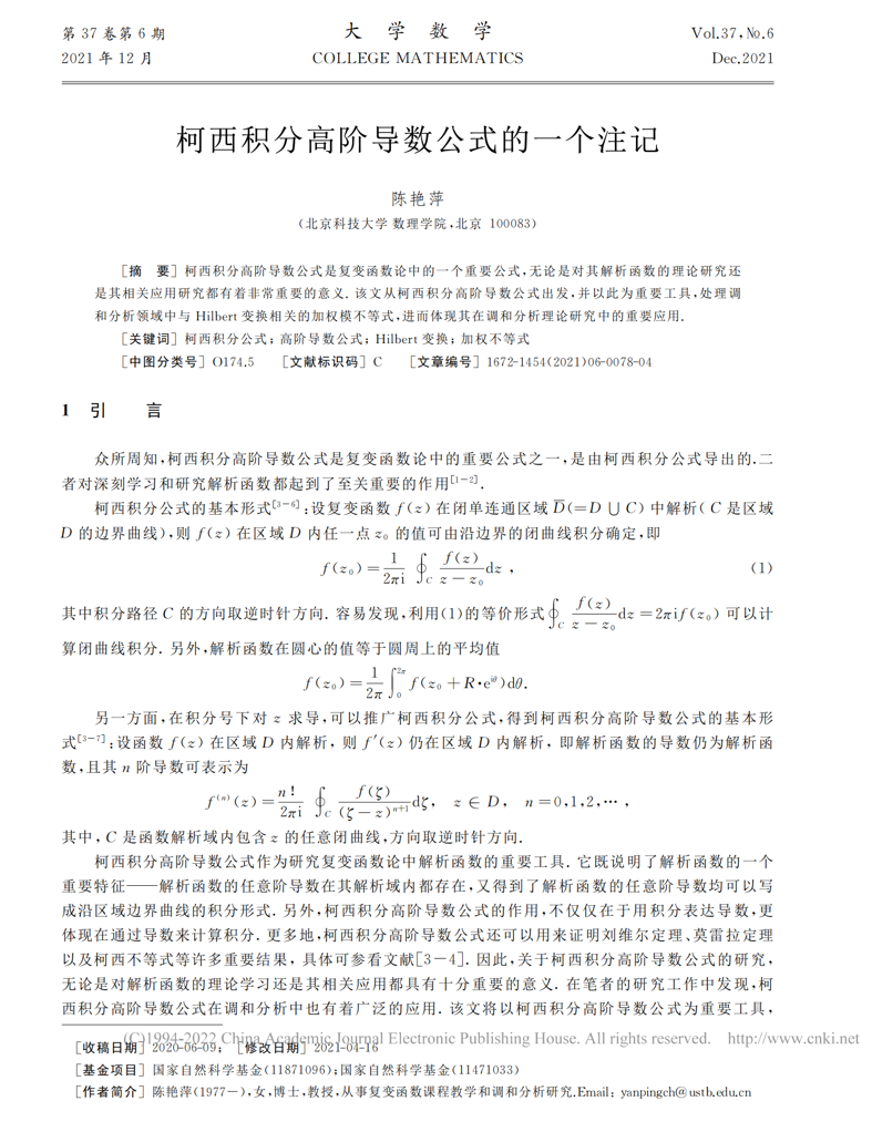 [13] 陈艳萍. 柯西积分高阶导数公式的一个注记. 大学数学,2021,37(6):78-81.