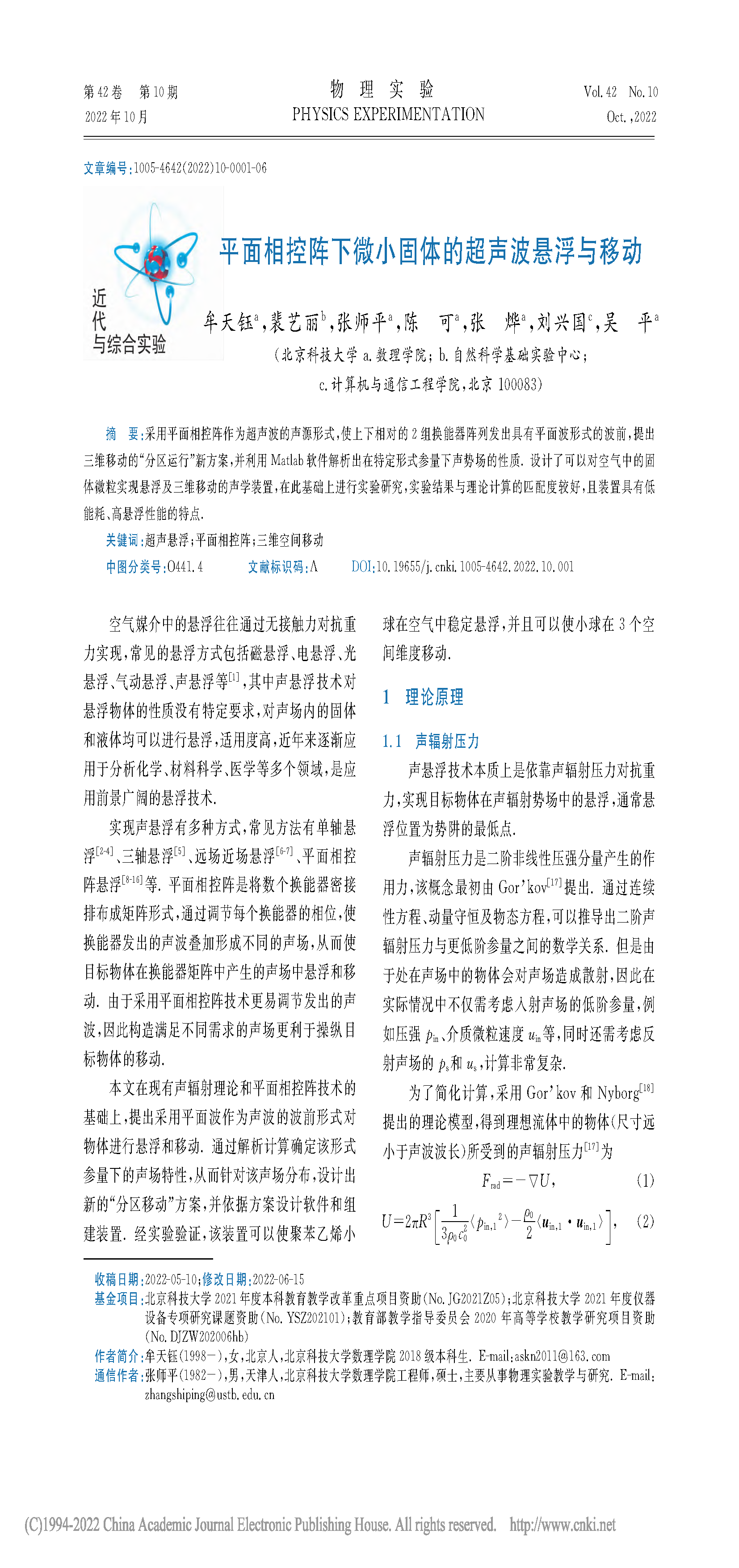 [56] 牟天钰,裴艺丽,张师平,陈可,张烨,刘兴国,吴平. 平面相控阵下微小固体的超声波悬浮与移动. 物理实验,2022,42(10):1-6.