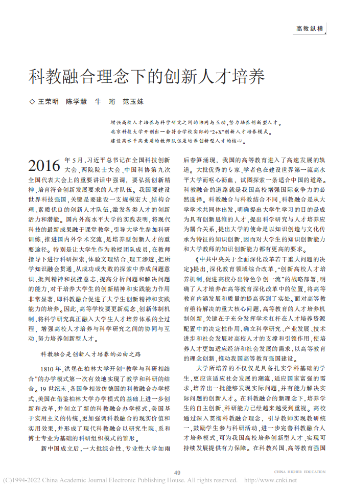[28] 王荣明,陈学慧,牛珩,范玉妹. 科教融合理念下的创新人才培养. 中国高等教育,2018,5:49-51.