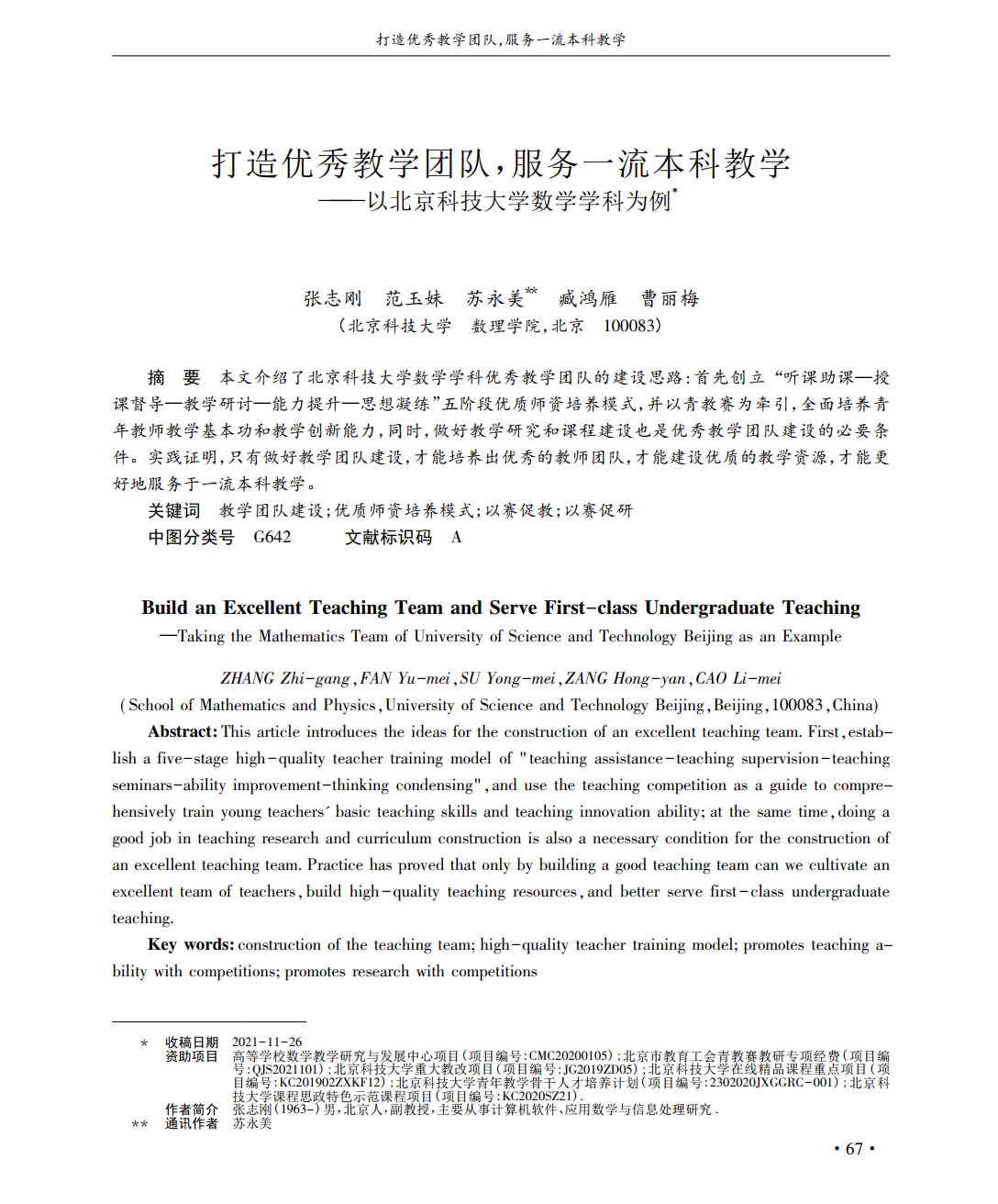 [23] 张志刚,范玉妹,苏永美. 打造优秀教学团队,服务一流本科教学. 高等理科教育,2022,8:67-74.