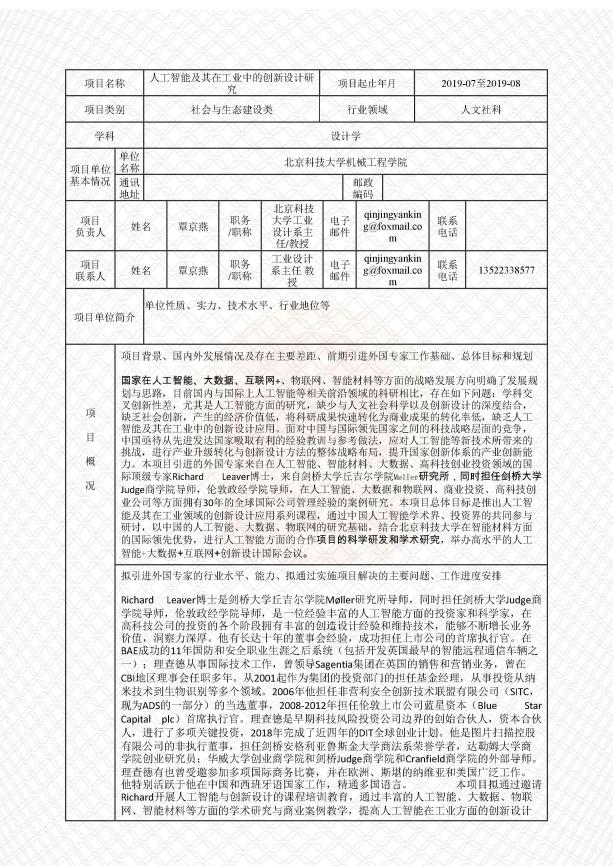 图 主持科学技术部“高端外国专家项目”,引进英国剑桥大学专家团队,共建《人工智能与创新设计》全英文课程与联合实验模块