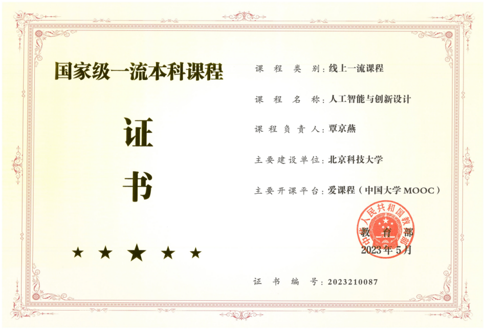 教学团队以一流课程建设为抓手完善课程体系,打造出多门高质量示范课程和实验教学平台,显著提升了课程教学质量和创新实践能力。覃京燕教授负责的课程《人工智能与创新设计》在2019年推出中文慕课、2020年推出国际版慕课,登陆中国慕课平台并获学习强国平台首页推荐,累计浏览量近200万。截至目前,已建成3门国家级一流本科课程:包括《人工智能与创新设计》线上一流课程、《Artificial Intelligence & Innovation Design》线上一流课程以及《无人驾驶车人工智能与创新设计虚拟仿真实践教学》虚拟仿真实验教学一流课程。依托教育部仿生扑翼机器人重点实验室,开发“智能信息交互设计”课程群和虚拟仿真实验教学平台,将人工智能技术融入设计实践教学。在课程思政方面,《人工智能技术与设计应用》获评2022年北京市课程思政示范课程。系列课程建设使理论教学与实践训练紧密结合,学生在沉浸式、交互式的课程体验中培养了跨学科创新能力,整体上构建起新工科背景下交叉融合的课程体系,为培养高水平复合型人才提供了有力支撑。主持科学技术部“高端外国专家项目”2 项(2019、2021),引进英国剑桥大学专家团队,共建《人工智能与创新设计》全英文课程与联合实验模块。