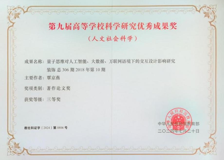 图 第九届高等学校科学研究优秀成果奖人文社会科学三等奖《量子思维对人工智能、大数据、万联网语境下的交互设计影响研究》