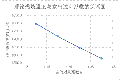 1)以上四组,可见随着空气过剩系数的增加,燃料的理论燃烧温度下降。但由于数据较少,所以无法确定下降趋势是不是线性或非线性的。