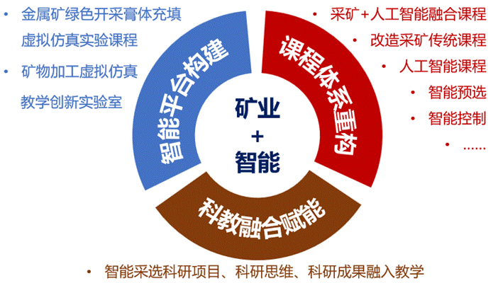 课程体系重构。2018年,北京科技大学在国内率先成立智能采矿创新班,培养方案在保留采矿工程核心课程前提下,升级改造采矿传统课程、引入人工智能核心课程、新建采矿+人工智能融合课程。矿物加工工程将智能预选、智能控制等内容纳入课程,多次修订培养方案,大幅提高智能选矿相关课程学分占比。