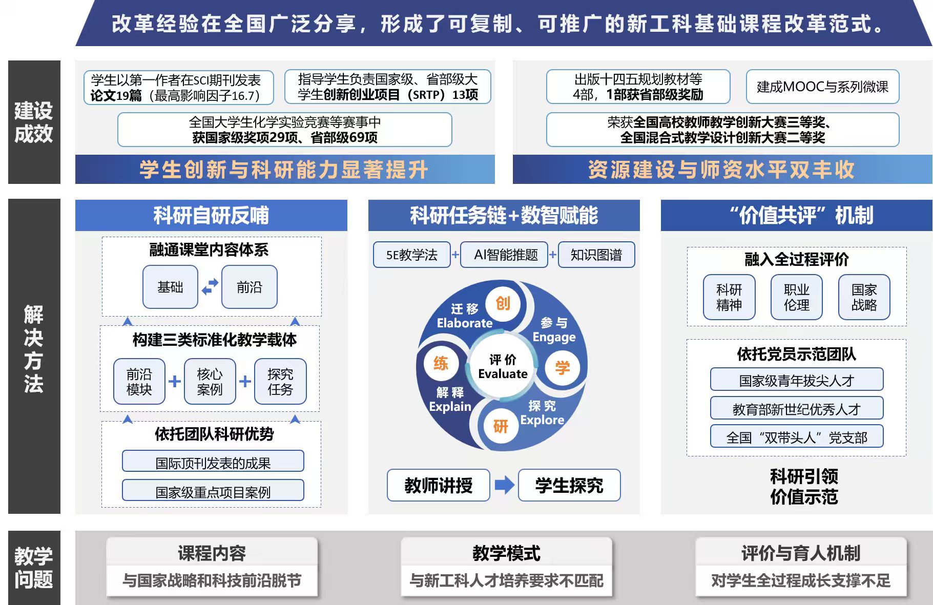 本成果以“科研自研反哺”为核心,依托团队在多孔材料、电化学等领域的科研优势,将团队在Nature Chemistry等国际顶刊发表的研究成果和国家级项目,系统提炼为“前沿模块—核心案例—探究任务”三类标准化载体,构建“基础—前沿”融通的内容体系。以“科研任务链+数智赋能”为抓手,依托5E教学法,将真实科研问题拆解为课堂探究任务,融合AI推题与知识图谱等数智工具,驱动学生在“学—研—练—创”全过程中的自主探究与协作创新,推动课堂由“教师讲授”向“学生探究”深度转型。以“价值共评”机制为牵引,将科研精神、国家战略与职业伦理融入全过程评价,依托国家级青年拔尖人才、新世纪优秀人才及全国高校“双带头人”党支部组成的党员示范团队,发挥科研引领与价值示范作用,强化课程的价值引领与育人功能。