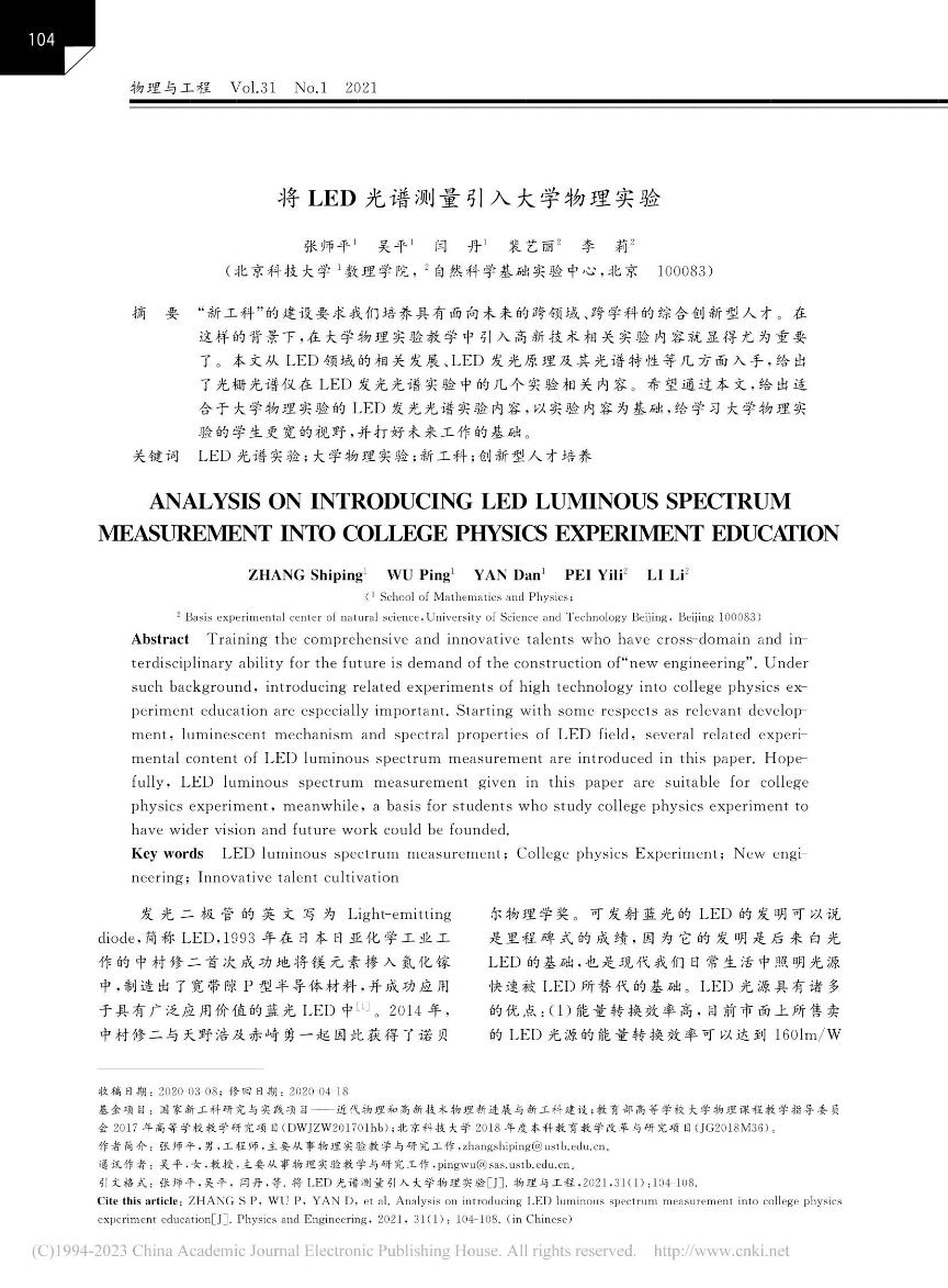 [11]          张师平,吴平,闫丹,裴艺丽,李莉. LED光谱测量引入大学物理实验. 《物理与工程》,202131(1)104-108.