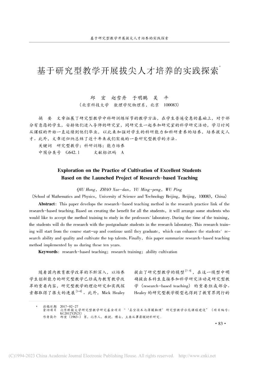 [21]          邱宏,赵雪丹,于明鹏,吴平. 基于研究型教学开展拔尖人才培养的实践探索. 《高等理科教育》,2017483-86,76.