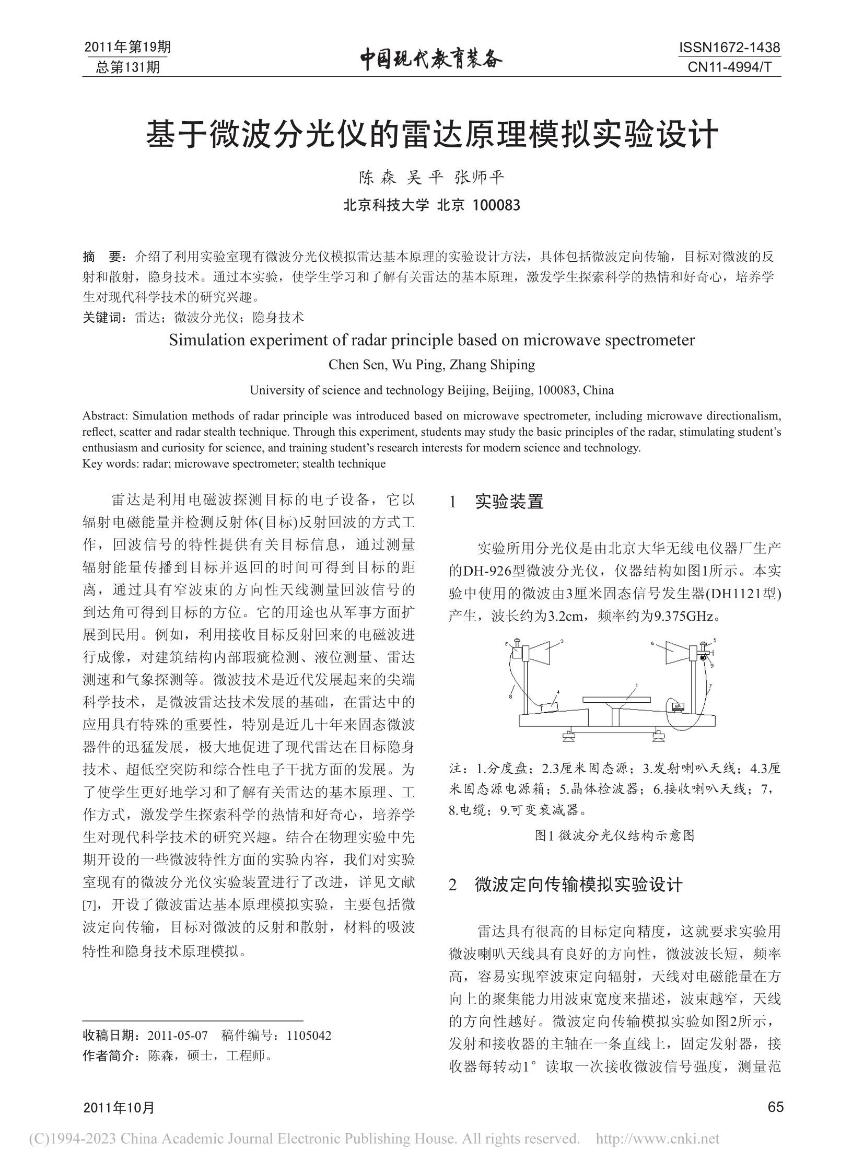 [36]          陈森,吴平,张师平.基于微波分光仪的雷达原理模拟实验设计.《中国现代教育装备》,20111965-66.