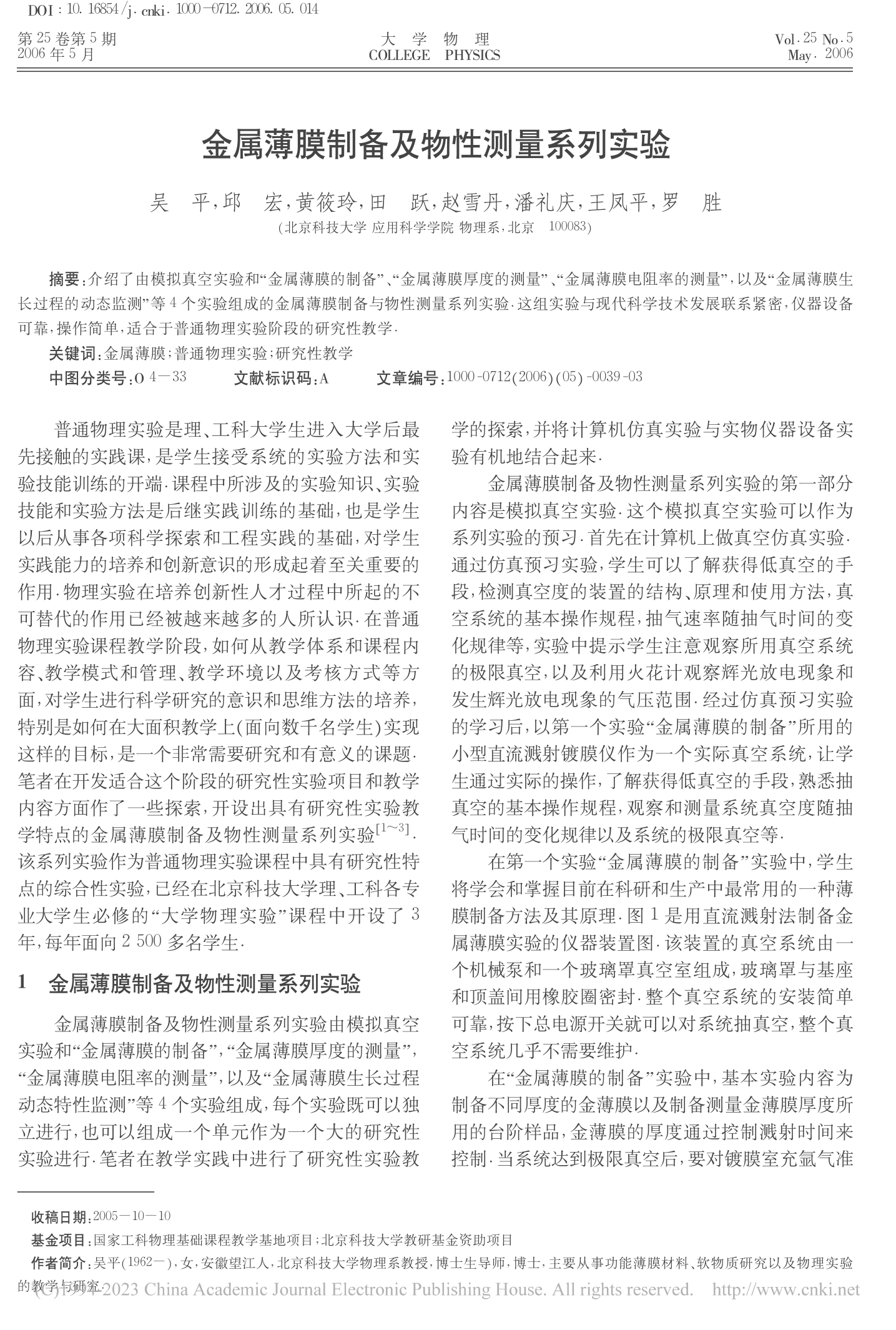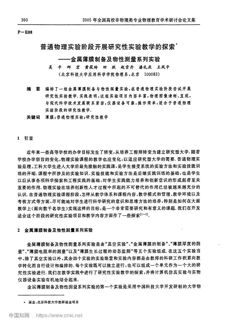 [47]          吴平,邱宏,黄筱玲,田跃,赵雪丹,潘礼庆,王凤平. 普通物理实验阶段开展研究性实验教学的探索——金属薄膜制备及物性测量系列实验. 2005年全国高校非物理类专业物理教育学术研讨会,2005360-362.