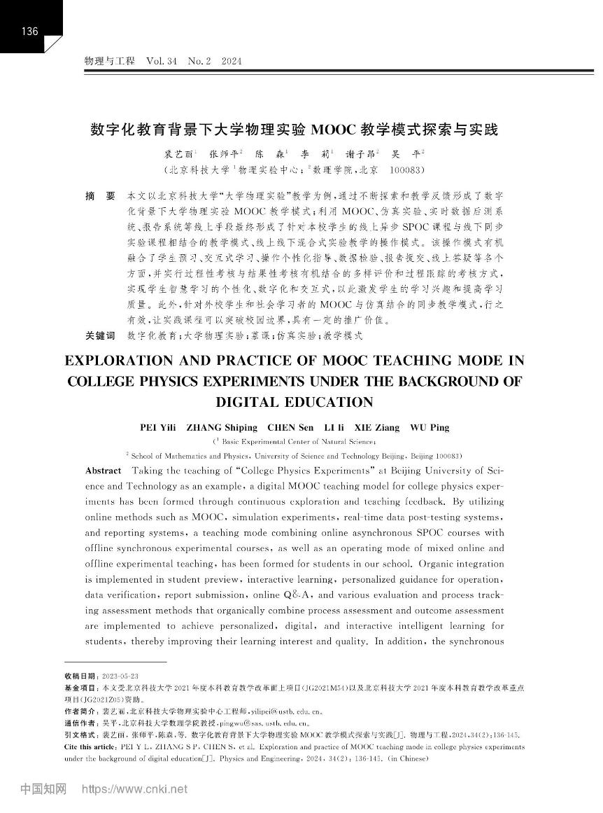 [2]   裴艺丽,张师平,陈森,李莉,谢子昂,吴平. 数字化教育背景下大学物理实验 MOOC教学模式探索与实践. 《物理与工程》,202434(2)136-145.