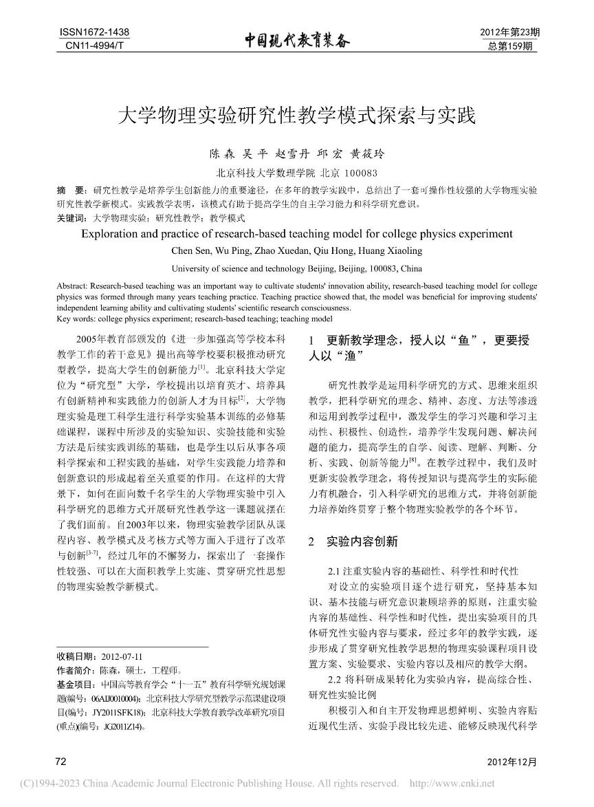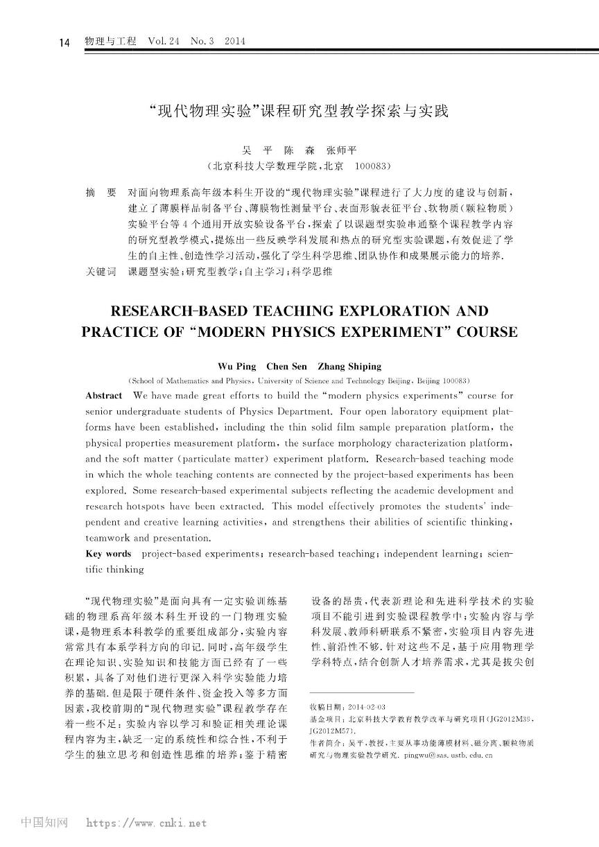 [27]          吴平,陈森,张师平. “现代物理实验课程研究型教学探索与实践. 《物理与工程》,201424(3)14-17.