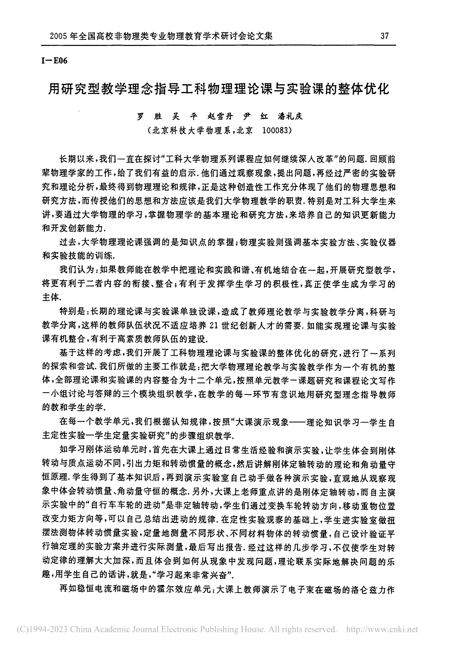 [46]          罗胜,吴平,赵雪丹,尹红,潘礼庆. 用研究型教学理念指导工科物理理论课与实验课的整体优化. 2005年全国高校非物理类专业物理教育学术研讨会,200537-39.