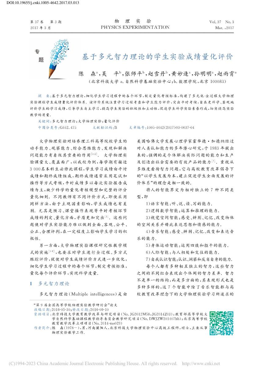 [22]          陈森,吴平,张师平,赵雪丹,黄妙逢,孙明明,赵雨霄. 基于多元智力理论的学生实验成绩量化评价.《物理实验》,201737(3)37-40,47.