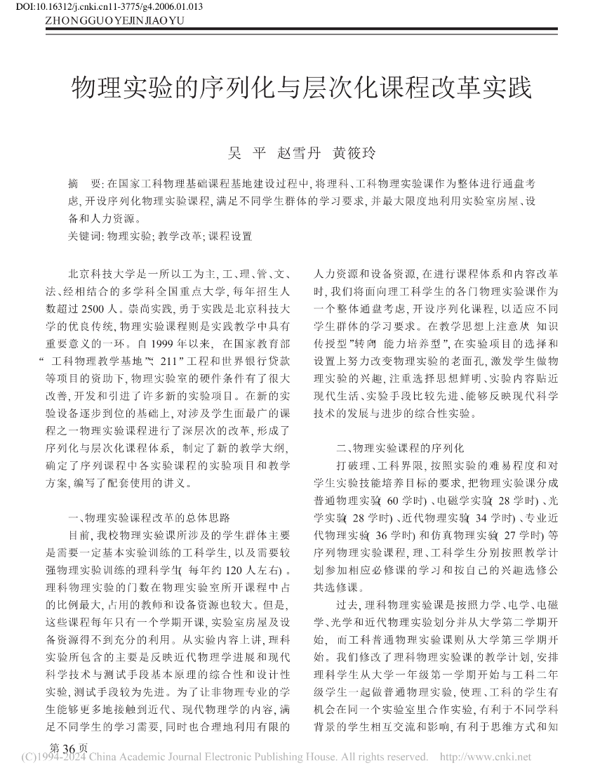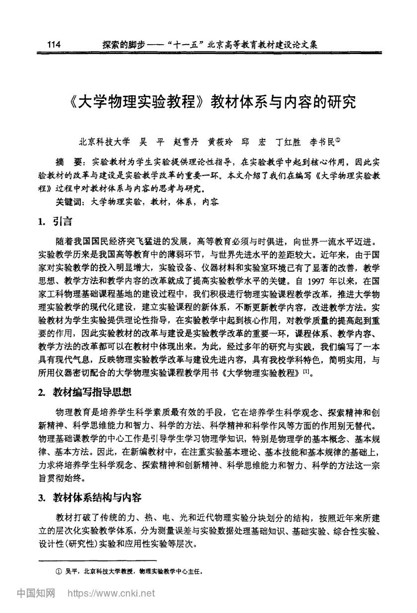 [37]          吴平,赵雪丹,黄筱玲,邱宏,丁红胜,李书民. 《大学物理实验教程》教材体系与内容的研究. 探索的脚步——“十一五北京高等教育教材建设论文集,2010114-117.