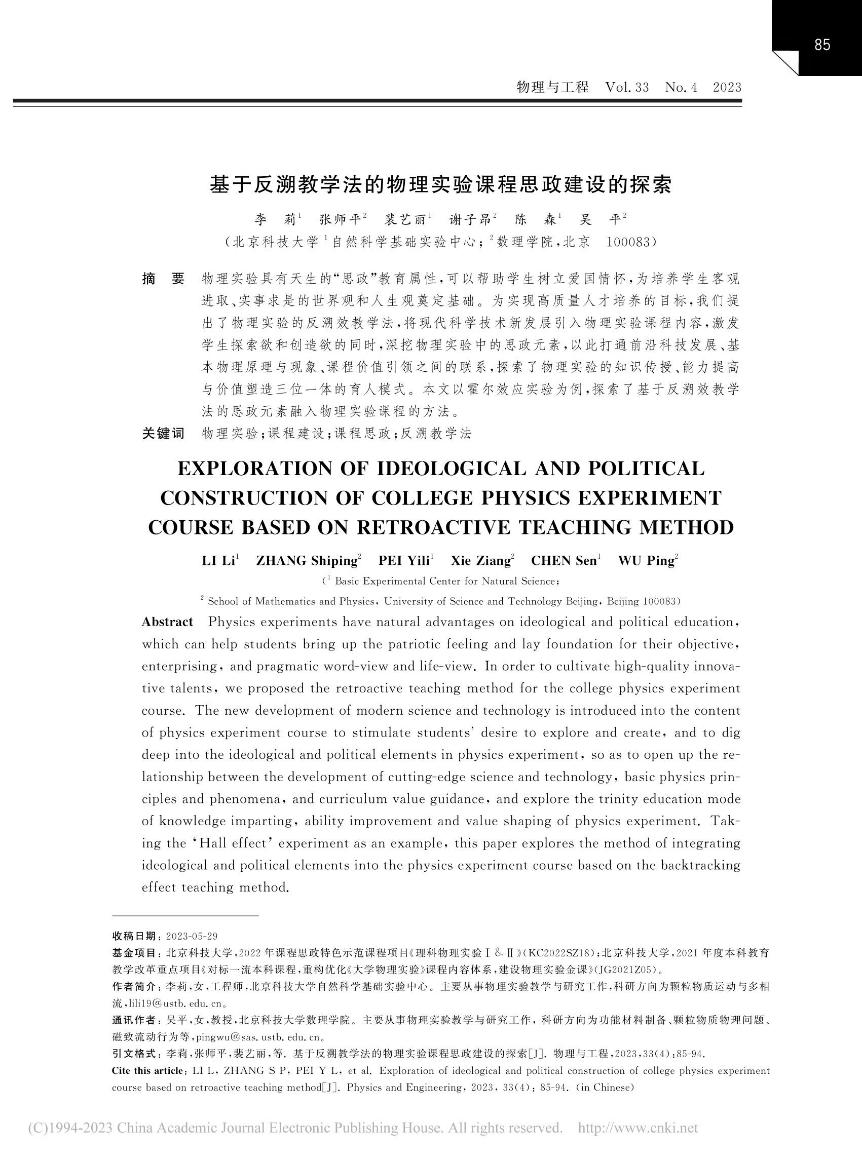 [6]   李莉,张师平,裴艺丽,谢子昂,陈森,吴平. 基于反溯教学法的物理实验课程思政建设的探索. 《物理与工程》,202333(4)85-94.