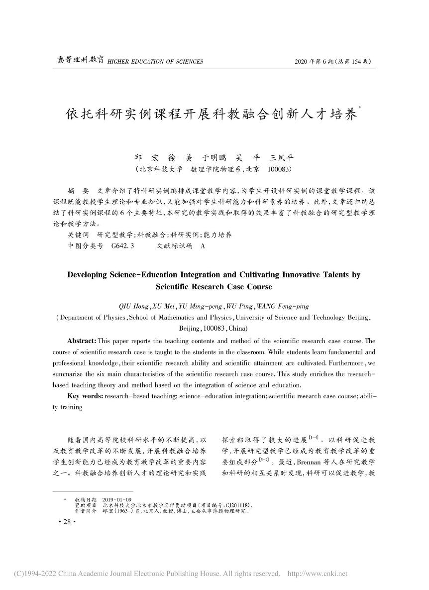 [12]          邱宏,徐美,于明鹏,吴平,王凤平. 依托科研实例课程开展科教融合创新人才培养. 《高等理科教育》,2020628-33.