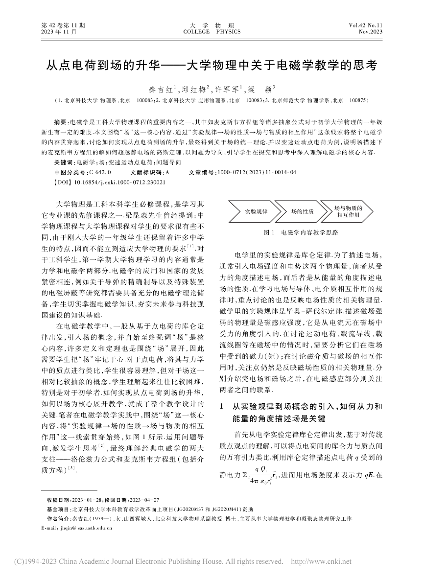[5]   秦吉红,邱红梅,许军军,梁颖. 从点电荷到场的升华——大学物理中关于电磁学教学的思考.《大学物理》,2023, 42(11)14-19.