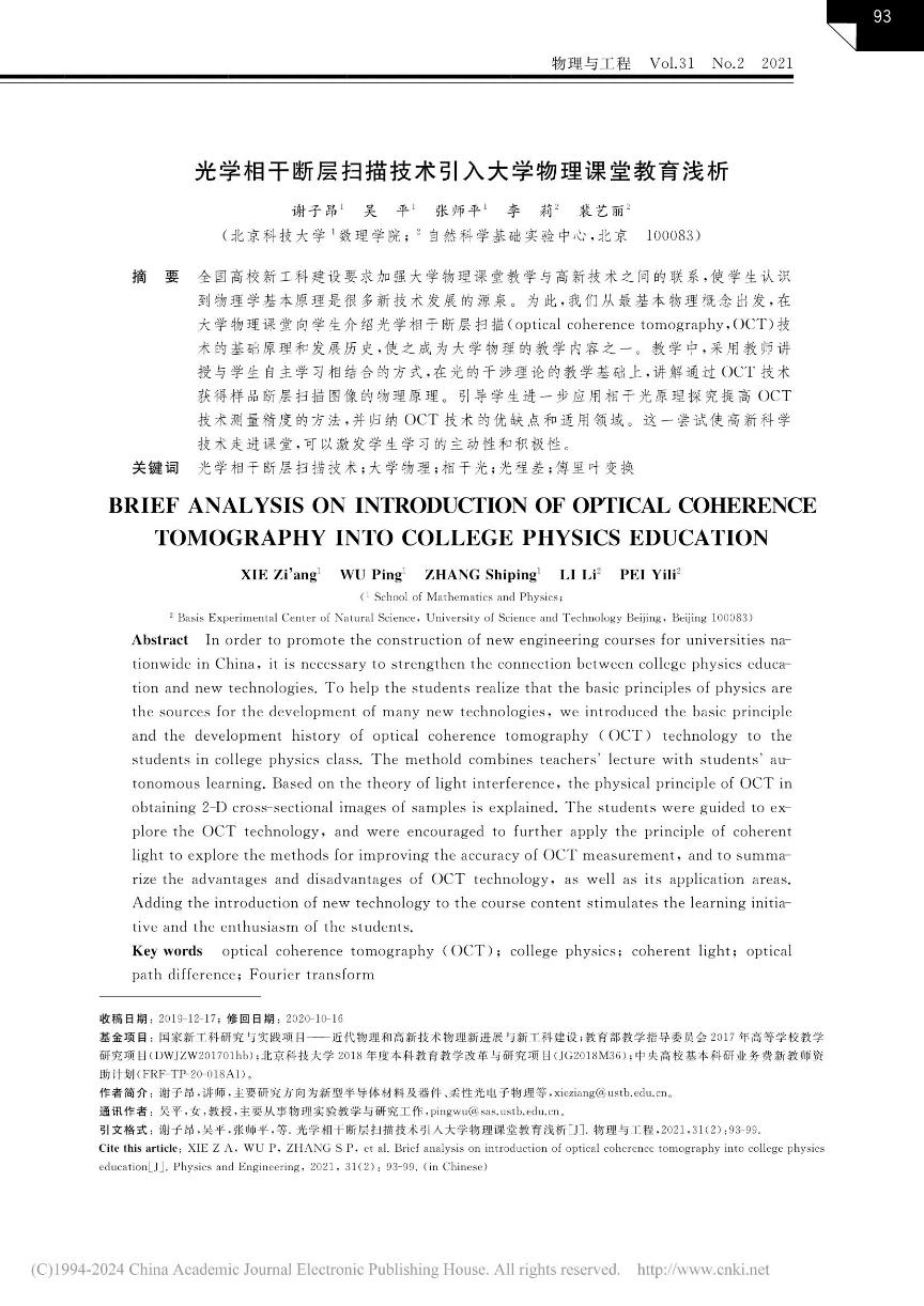 [10]          谢子昂,吴平,张师平,李莉,裴艺丽. 光学相干断层扫描技术引入大学物理课堂教育浅析. 《物理与工程》,202131(2)93-99.