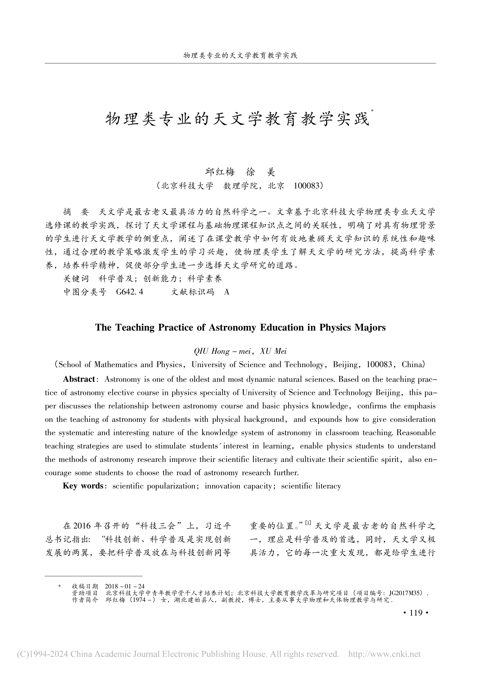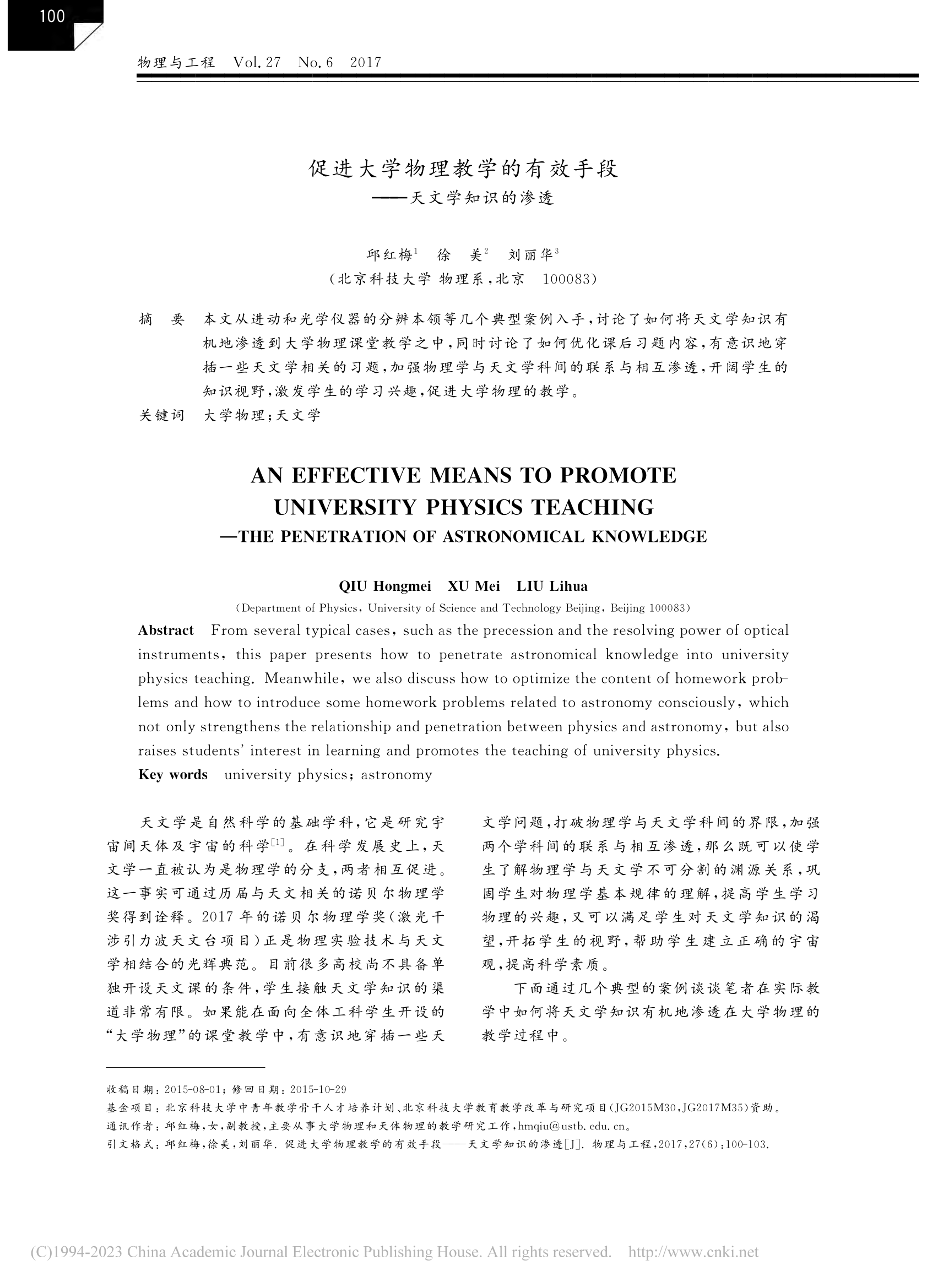 [17]          邱红梅,徐美.物理类专业的天文学教育教学实践.《高等理科教育》,2018, 6119-125.