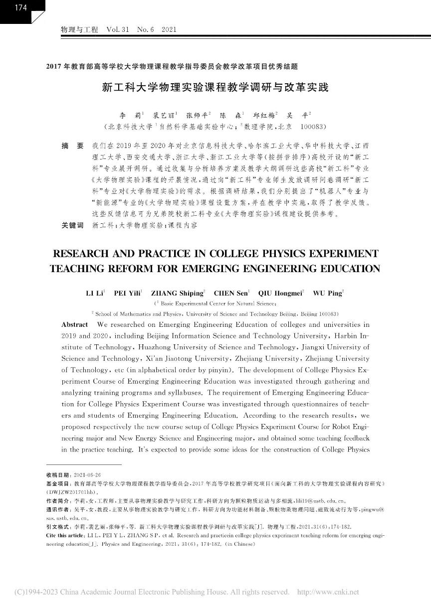 [8]   李莉,裴艺丽,张师平,陈森,邱红梅,吴平. 新工科大学物理实验课程教学调研与改革实践. 《物理与工程》,202131(6)174-182.