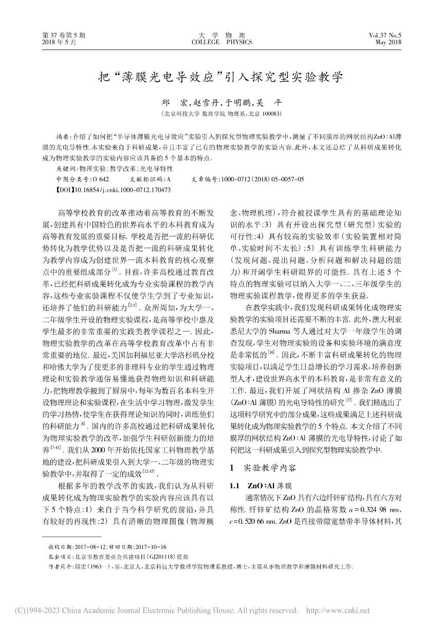 [15]          邱宏,赵雪丹,于明鹏,吴平. 薄膜光电导效应引入探究型实验教学. 《大学物理》201837(5)57-61,67.