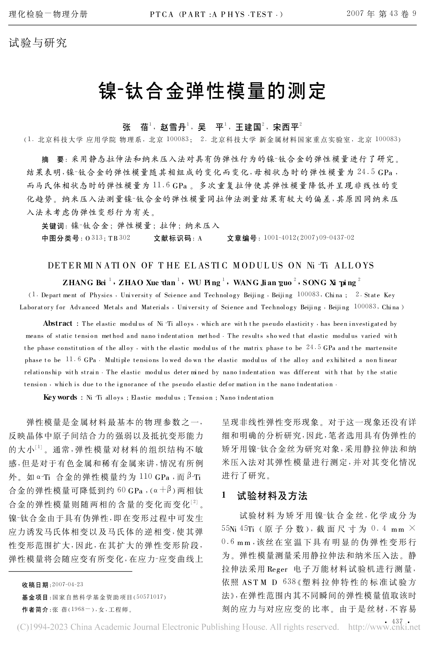 [40]          张蓓,赵雪丹,吴平,王建国,宋西平. -钛合金弹性模量的测定. 《理化检验(物理分册)》,200743(9)437-438,443.