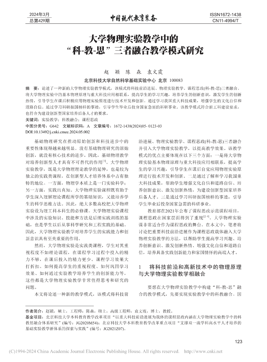 [3]   赵颖,陈森,袁文霞. 大学物理实验教学中的--三者融合教学模式研究. 《中国现代教育装备》,2024429123-125.