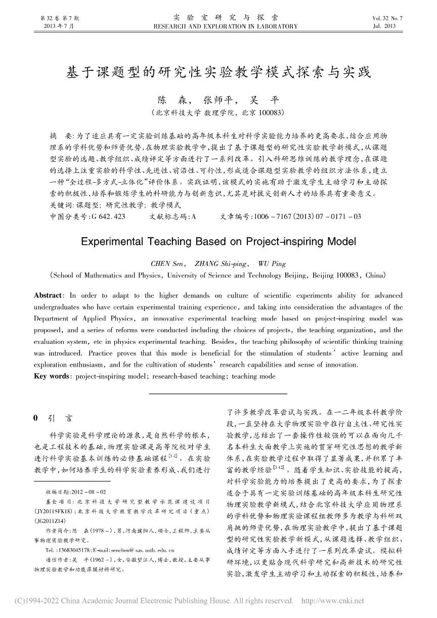 [31]          陈森,张师平,吴平. 基于课题型的研究性实验教学模式探索与实践. 《实验室研究与探索》,201332(7)171-174.