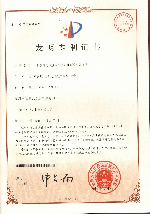 [8] 黄妙逢,巨新,张娜,严婷婷,于莹. 一种具有层次孔结构的磁性颗粒制备方法[P]. CN104157390A, 2014-11-19.