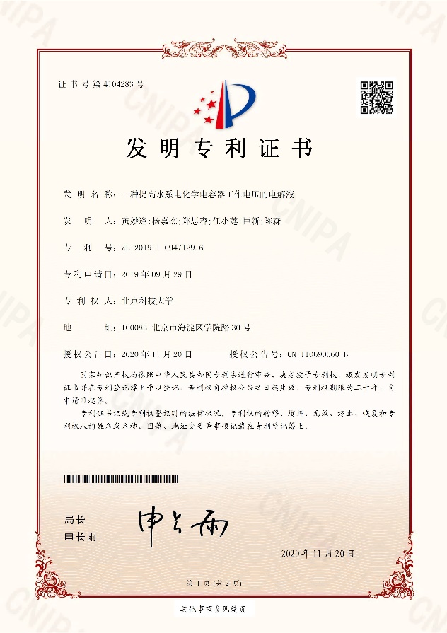 [2] 黄妙逢,杨嘉杰,郑思容,任小莲,巨新,陈森. 一种提高水系电化学电容器工作电压的电解液[P]. CN110690060B, 2020-11-20.